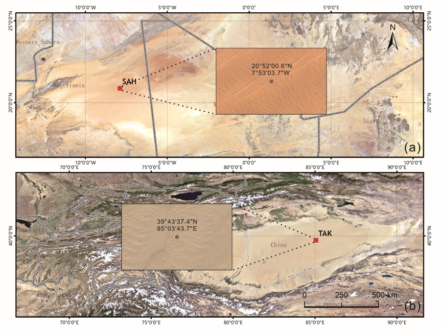 图1:撒哈拉沙漠(SAH)和塔克拉玛干沙漠(TAK)验证点的地理分布