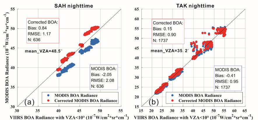与VIIRS卫星的交叉验证表明,校正后的辐射值与星下点参考观测高度一致。