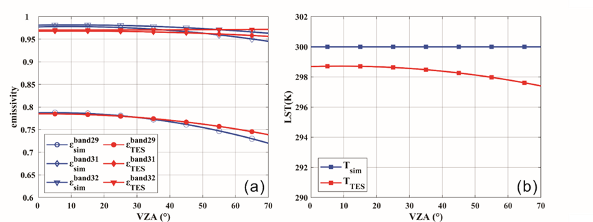 图2:不同VZA下的温度和发射率(蓝线代表模拟样品WGD的发射率和LST(300K);红线代表TES导出的发射率和LST)