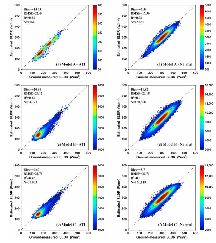图1展示了CERES三个模型的总体性能。在ATI条件下,SLDR的分布范围相对较窄,主要集中在100到250 W/m2之间。这种低值普遍的情况是因为ATI事件主要发生在极地地区和夜间。CERES晴空SLDR产品被显著低估,导致模型A、B和C分别出现了较大的负偏差(Bias),分别为-14.63 W/m2、-20.81 W/m2、and -9.67 W/m2,相应的均方根误差(RMSE)值分别为22.44 W/m2、29.15 W/m2和22.79 W/m2。相反,正常大气条件下的SLDR样本分布在更宽的范围(100–450 W/m2),并且围绕1:1线对称分布,其偏差分别为-5.38 W/m2、-11.82 W/m2、and -5.7 W/m2,RMSE为17.36 W/m2、23.18 W/m2和21.71 W/m2。
