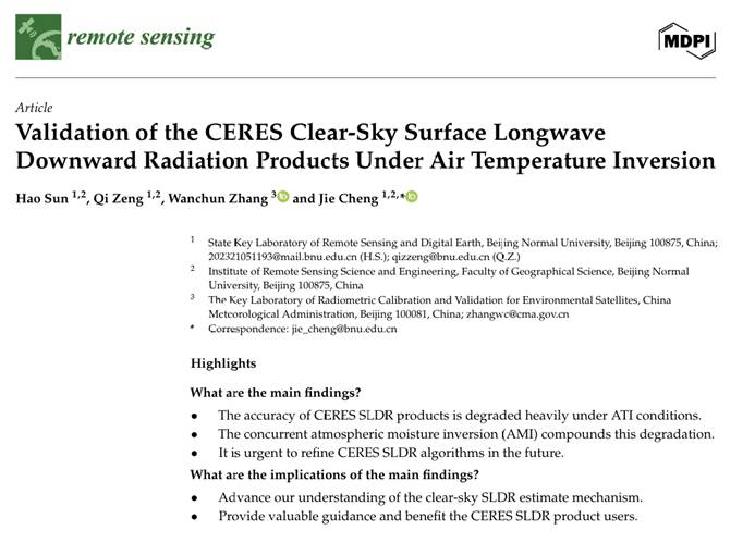 Sun, H.; Zeng, Q.; Zhang, W.; Cheng, J. Validation of the CERES Clear-Sky Surface Longwave Downward Radiation Products Under Air Temperature Inversion. Remote Sens. 2025, 17, 4012. https://doi.org/10.3390/rs17244012
